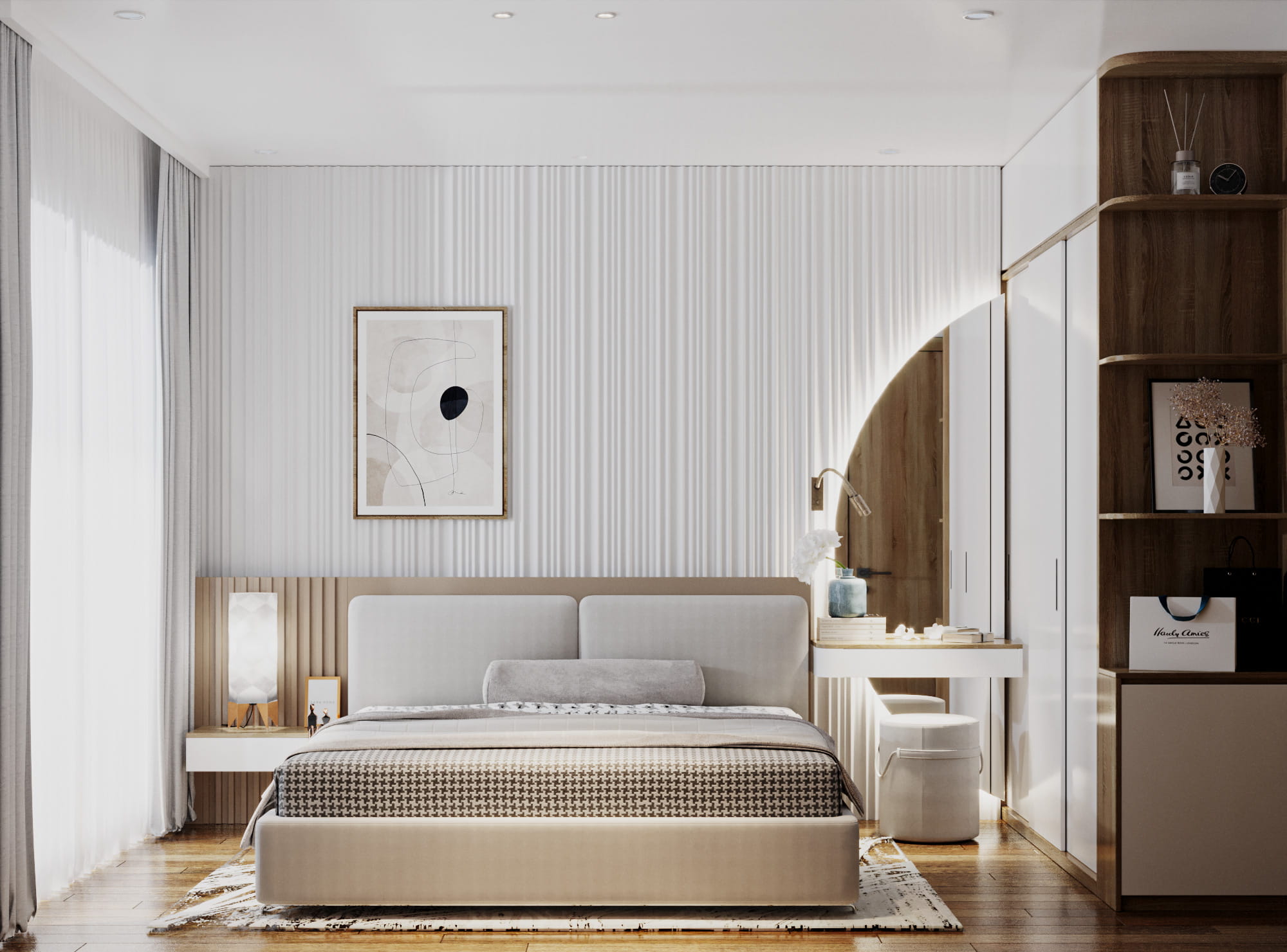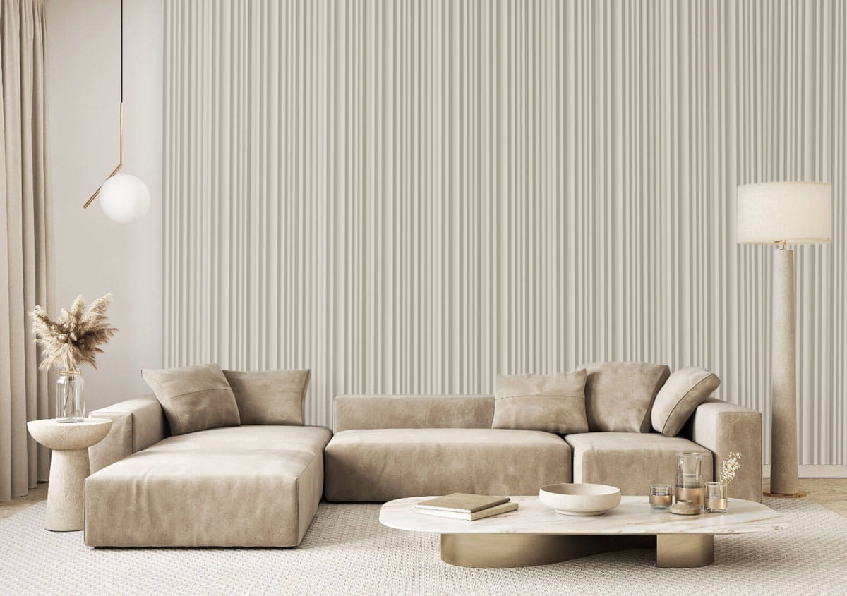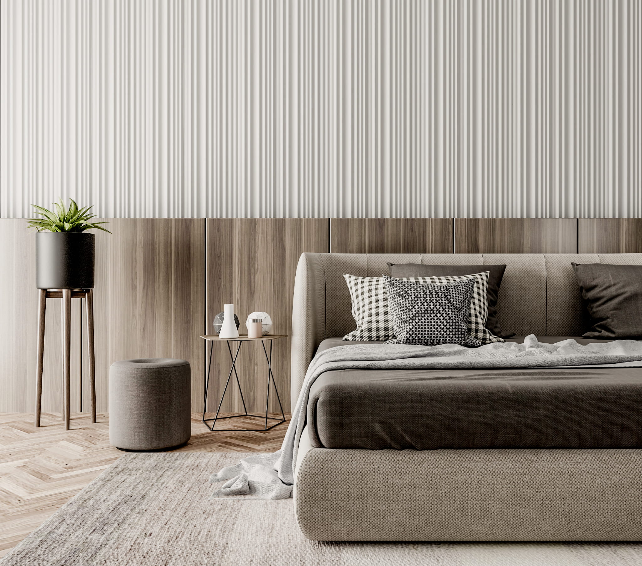 Model Loft Lamellini 04 to ciekawy wzór lameli gipsowych o różnej grubości i rozmieszczeniu. Panele 3D po ułożeniu na ścianie tworzą symetryczny i przyciągający wzrok deseń. Pionowe pasy optycznie powiększają pomieszczenie, dodatkowo je wyciszając. Panele gipsowe można zamontować na dużej powierzchni ściany lub tylko na niewielkim jej fragmencie.