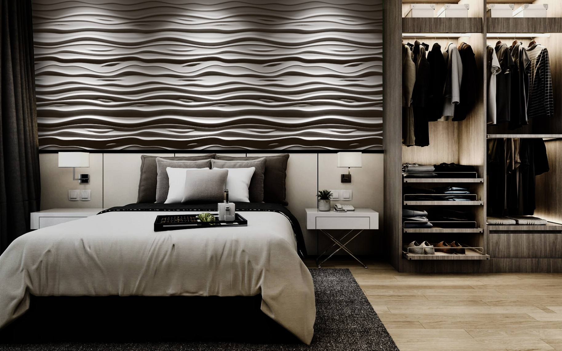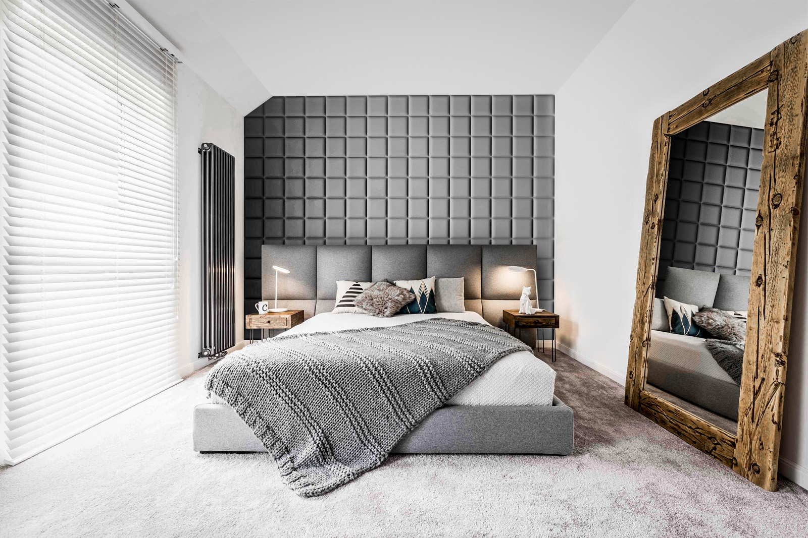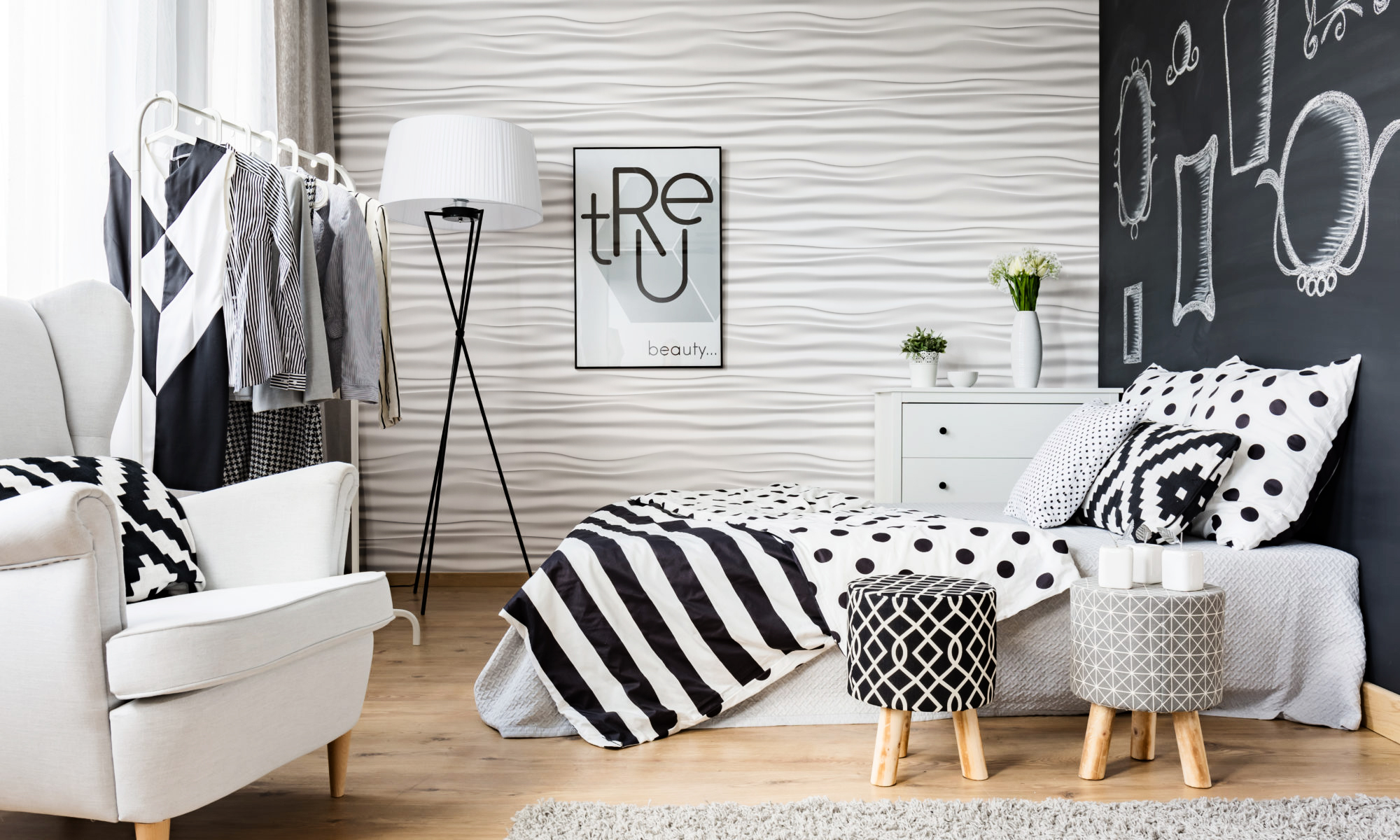 Dodatkami do sypialni będą przede wszystkim poduszki, którymi możemy ozdobić nasze łóżko. W sypialniach urządzonych w praktycznie każdym stylu możemy postawić w wazonie kwiaty. Nada to pomieszczeniu bardziej romantycznego i przytulnego wyglądu. Innymi dodatkami będzie zegar, który możemy zawiesić na ścianie lub postawić na półce lub komodzie. Na ścianach możemy zdecydować się na jeden duży element dekoracyjny, taki jak na przykład tapeta, panele 3d lub beton architektoniczny lub zawiesić kilka obrazów. Ich ramy mogą korespondować z dodatkami w naszym wnętrzu, jeśli są złote, złote niech będą też dodatki, jeśli drewniane – niech z drewna będą inne ozdoby. Inne ozdoby, takie jak stojące figury, pudełka na drobiazgi czy rzeźby, powinniśmy dopasować do stylu naszej sypialni.
